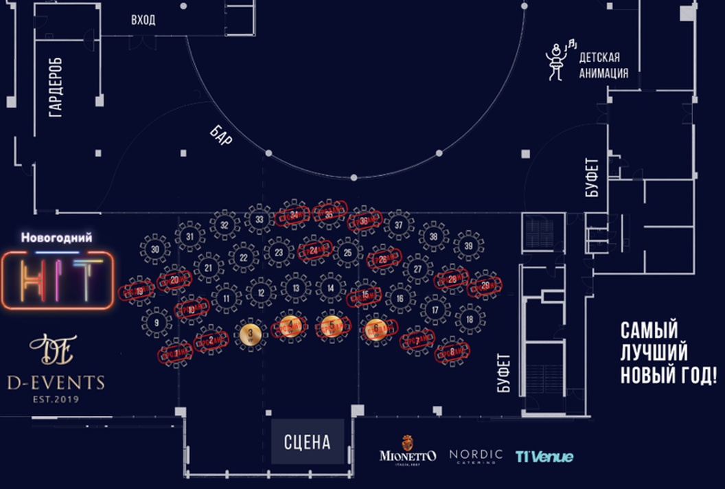 Столы № 30,31,32,37,38,39 при покупке от 4-х билетов цена 215 евро *обычная цена 230 евро